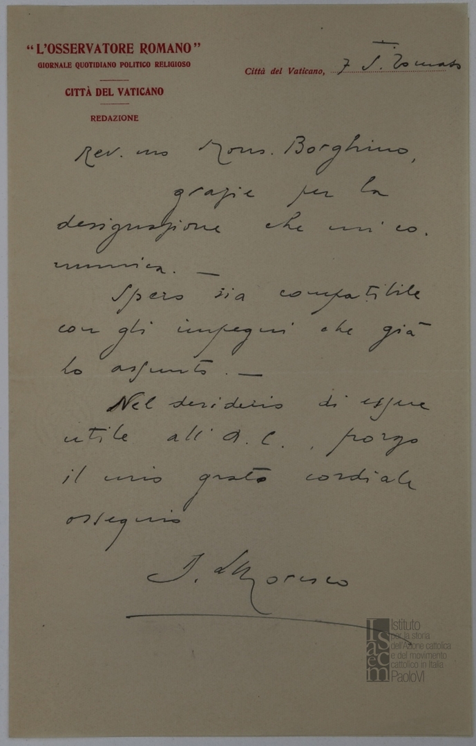 Lettera di mons. Luigi Moresco dell'Osservatore Romano, a mons. Giuseppe Borghino, vice direttore generale dell'ACI