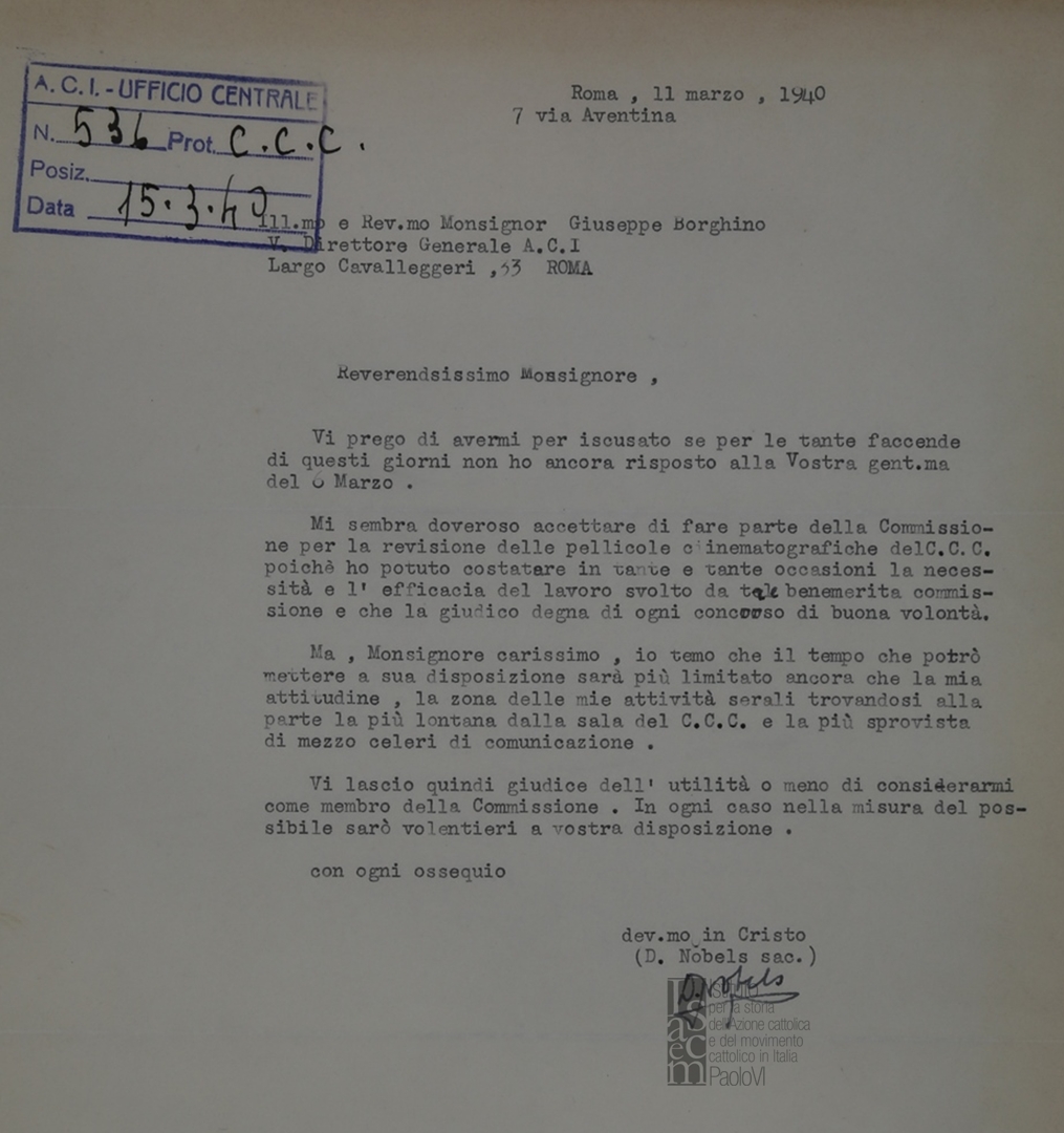 Desiderio Nobels ringrazia mons. Giuseppe Borghino per la designazione a membro della Commissione per la revisione delle pellicole cinematografiche del CCC. Dattiloscritto
