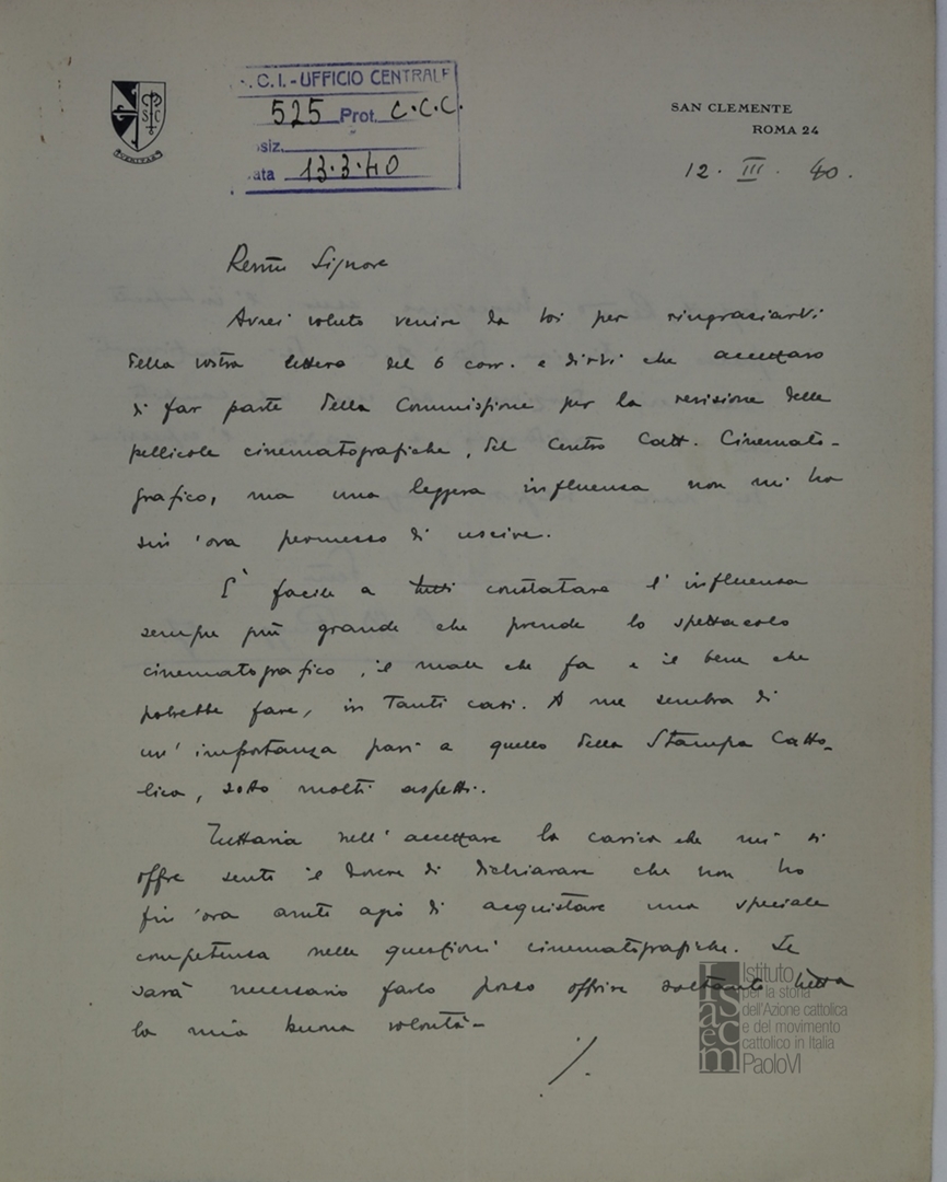 Agostino Enrico Domenico Ruggi d'Aragona ringrazia mons. Giuseppe Borghino per la designazione a membro della Commissione per la revisione delle pellicole cinematografiche del CCC. Manoscritto