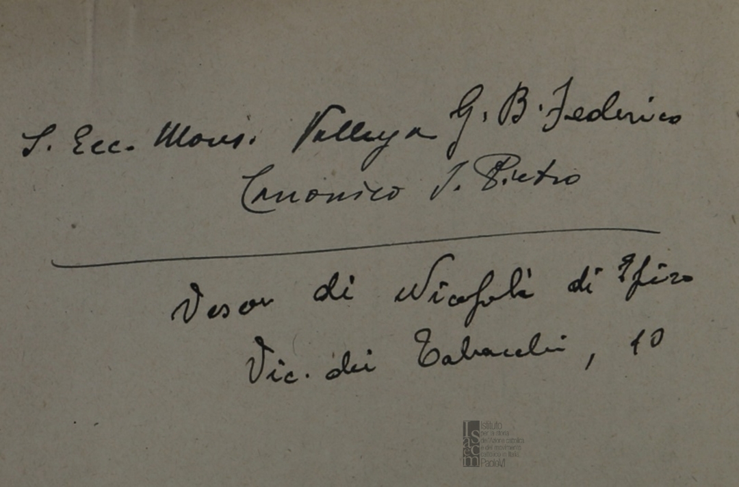 Lettera di mons. Federico Vallega, arcivescovo di Nicopoli di Epiro, a mons. Giuseppe Borghino, vice direttore generale dell'ACI