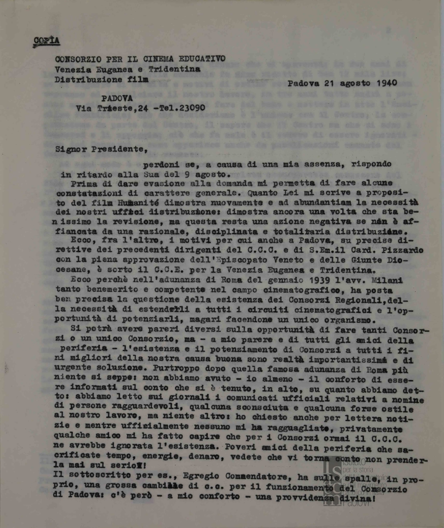 Lettera di don Francesco Dalla Zuanna, delegato ecclesiastico presso l'Ufficio di Venezia euganea e tridentina del Consorzio per il cinema educativo, a Lamberto Vignoli, presidente del Centro cattolico cinematografico - CCC