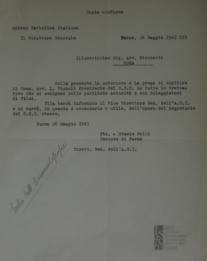 Mons. Evasio Colli autorizza e invita Urbano Cioccetti a rappresentare Lamberto Vignoli nelle trattative con le pubbliche autorità e con i noleggiatori di film. Dattiloscritto