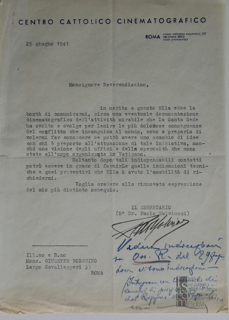 Paolo Salviucci scrive a mons. Giuseppe Borghino in merito ad un progetto per una documentazione cinematografica dell'attività della Santa Sede. Dattiloscritto