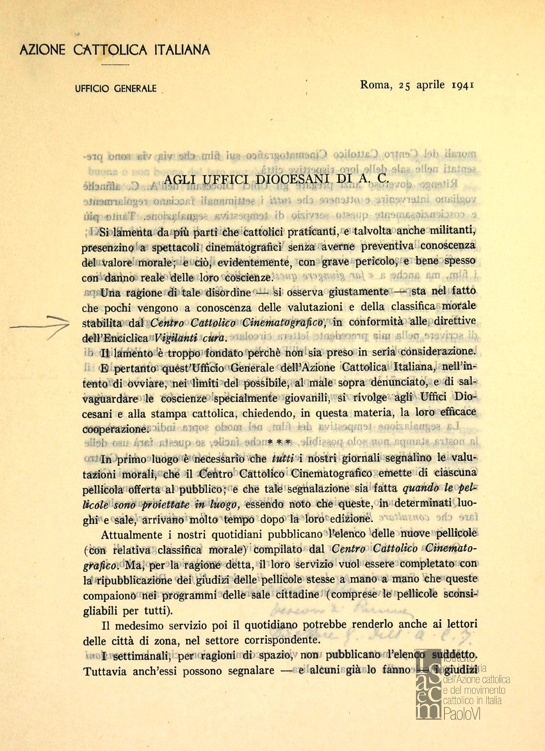 Richiesta di cooperazione affinché vengano rispettate le valutazioni e la classifica morale degli spettacoli cinematografici stabilita dal Centro cattolico cinematografico - CCC in conformità alle direttive dell'enciclica Vigilanti Cura, con raccomandazione di osservare quanto riportato in proposito dalla stampa cattolica. Dattiloscritto
