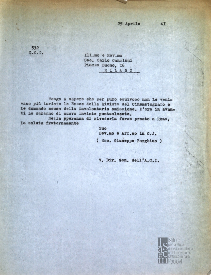 Lettera di mons. Giuseppe Borghino, vice direttore generale dell'ACI, a Carlo Canziani, direttore del Consorzio per il cinema educativo - CCE
