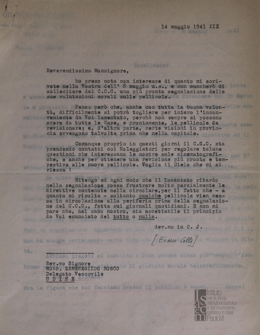 Mons. Evasio Colli risponde a mons. Ermenegildo Bosco in merito alla richiesta di una tempestiva segnalazione della classificazione dei film da parte del Centro cattolico cinematografico - CCC. Dattiloscritto