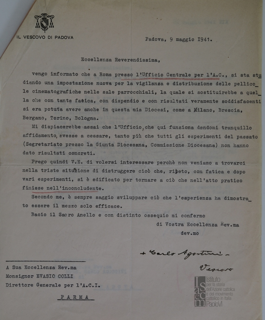 Lettera di mons. Carlo Agostini, vescovo di Padova, a mons. Evasio Colli, vescovo di Parma e direttore generale dell'ACI