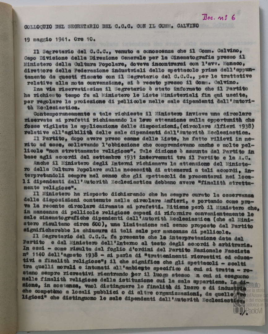 "Colloquio del segretario del C.C.C. con il comm. Calvino. 19 maggio 1941, ore 10"