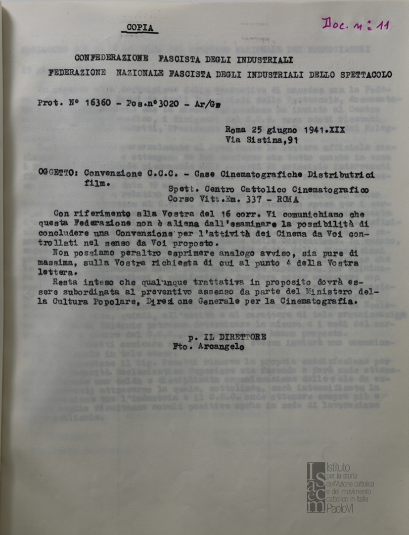 Lettera di risposta della Federazione nazionale fascista degli Industriali dello spettacolo, a firma del direttore Francesco Arcangeli, al Centro cattolico cinematografico - CCC