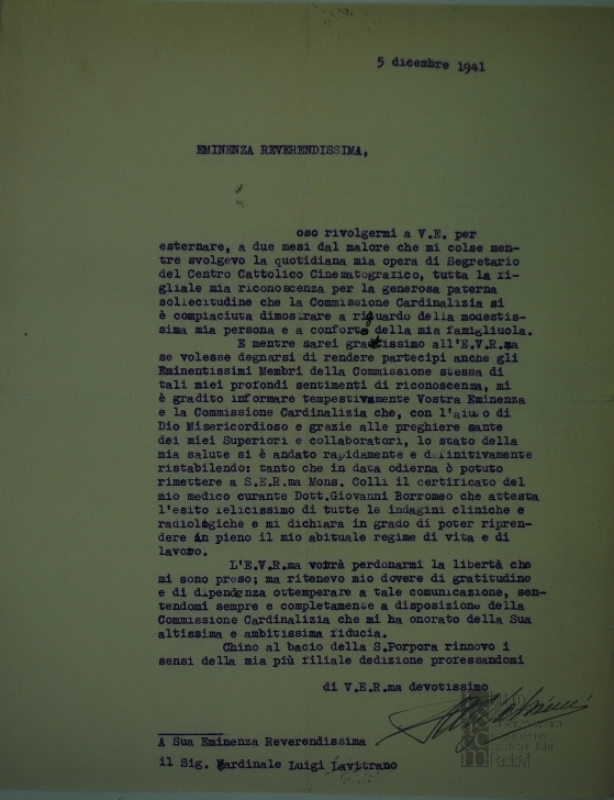 Lettera di Paolo Salviucci, segretario del Centro cattolico cinematografico - CCC, al cardinale Luigi Lavitrano, dell'arcivescovado di Palermo e presidente della Commissione cardinalizia dell'ACI