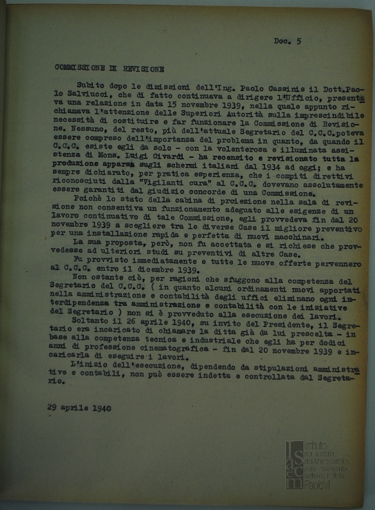 Resoconto dell'attività di revisione sulla produzione cinematografica svolta dal Centro, con segnalazione dell'importanza della Commissione di revisione e indicazioni sullo stato della cabina di proiezione della sala di revisione. Dattiloscritto