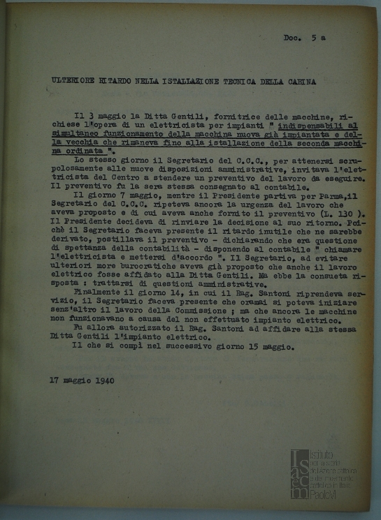 Resoconto delle attività del Centro, con segnalazione del ritardo nell'installazione della strumentazione tecnica della cabina di proiezione della sala di revisione. Dattiloscritto