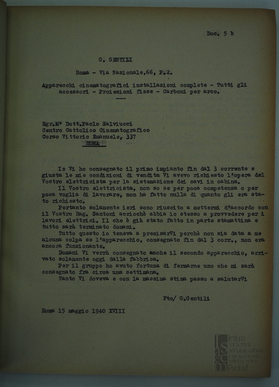 G. Gentili scrive a Paolo Salviucci in merito alla fornitura di apparecchi cinematografici e ai lavori elettrici effettuati nella cabina di proiezione del Centro. Dattiloscritto