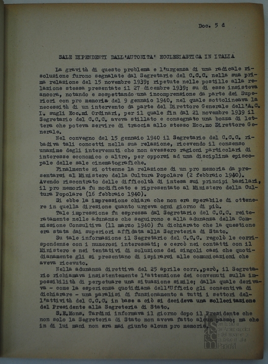 Resoconto sulle sale cinematografiche dipendenti dall'autorità ecclesiastica. Dattiloscritto