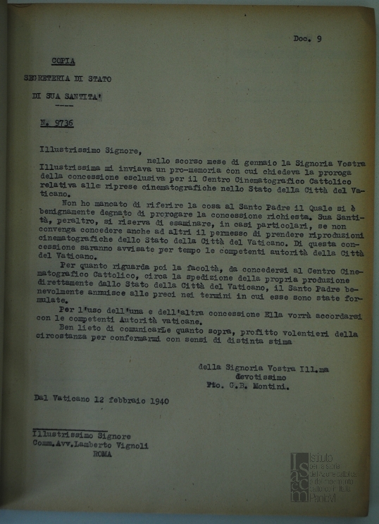 Giovanni Battista Montini scrive a Lamberto Vignoli a proposito della richiesta di proroga della concessione esclusiva per il Centro cattolico cinematografico per le riprese cinematografiche nello stato della Città del Vaticano. Dattiloscritto