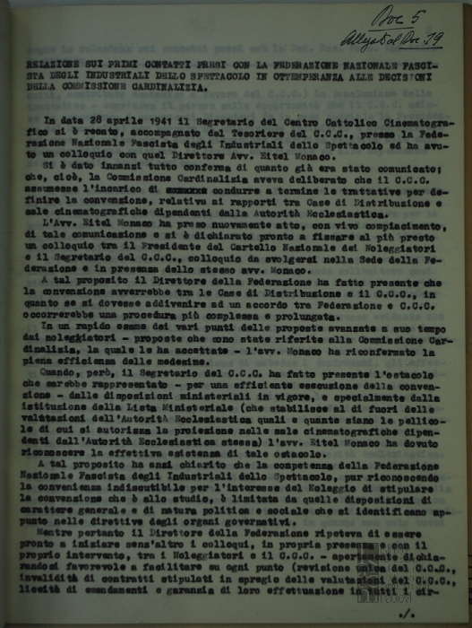 "Relazione sui primi contatti presi con la Federazione nazionale fascista degli industriali dello spettacolo in ottemperanza alle decisioni della Commissione cardinalizia", a cura di Paolo Salviucci, segretario del Centro cattolico cinematografico - CCC