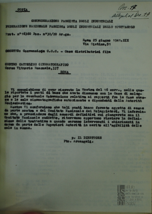 Lettera della Federazione nazionale fascista degli industriali dello spettacolo, a firma Arcangelo, al Centro cattolico cinematografico - CCC