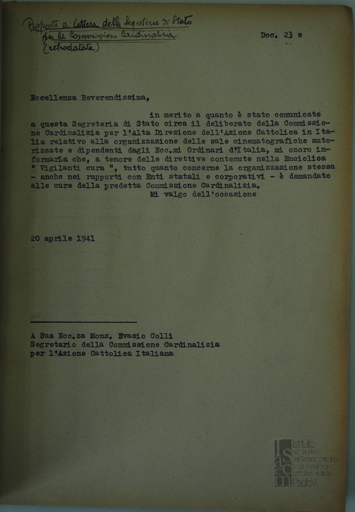 Lettera di Paolo Salviucci, segretario del Centro cattolico cinematografico - CCC, a mons. Evasio Colli, segretario della Commissione cardinalizia per l'ACI