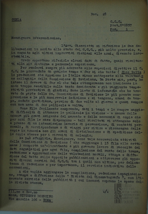 Paolo Salviucci scrive a mons. Giuseppe Borghino in merito all'attività di controllo sulle pellicole esercitata dal CCC e dalla Commissione di revisione. Dattiloscritto