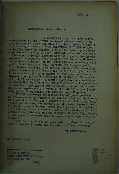 Lettera di Paolo Salviucci, segretario del Centro cattolico cinematografico - CCC, a mons. Giuseppe Borghino, vice direttore generale dell'ACI
