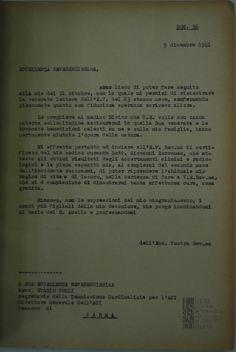Lettera di Paolo Salviucci, segretario del Centro cattolico cinematografico - CCC, a mons. Evasio Colli, vescovo di Parma, direttore generale dell'ACI e segretario della Commissione cardinalizia