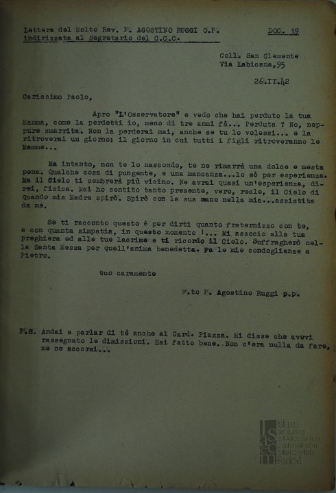 Padre Agostino Ruggi invia a Paolo Salviucci le condoglianze per la perdita della madre e comunica di essere al corrente delle sue dimissioni. Dattiloscritto