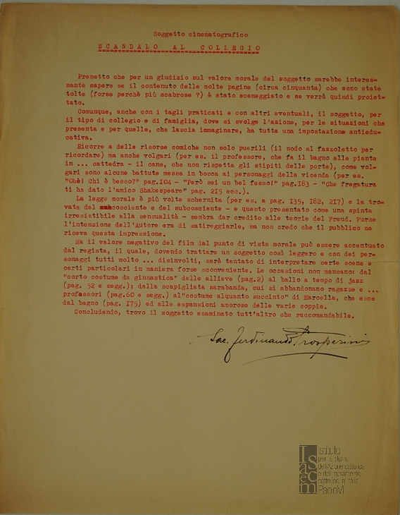 Giudizio morale del soggetto cinematografico, ritenuto sconveniente e antieducativo, a firma di don Ferdinando Prosperini, dal 1944 consulente ecclesiastico dell'Ente dello spettacolo. Dattiloscritto