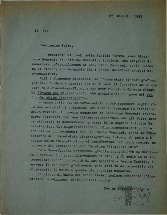 Mons. Evasio Colli chiede a papa Pio XII la concessione di un'onorificenza a don Carlo Canziani, direttore del Consorzio per il cinema educativo - CCE, e al cardinale Ildefonso Schuster, arcivescovo di Milano. Dattiloscritto