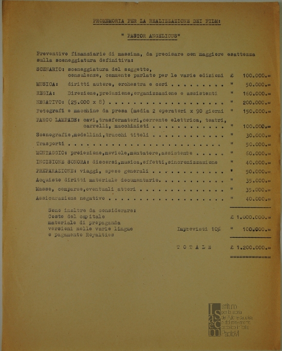 "Pro memoria per la realizzazione del film 'Pastor Angelicus'"