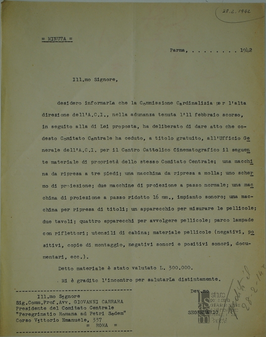 Lettera di Diego Fabbri, segretario del Centro cattolico cinematografico - CCC, a Giovanni Carrara, presidente del Comitato centrale della Peregrinatio romana ad Petri sedem