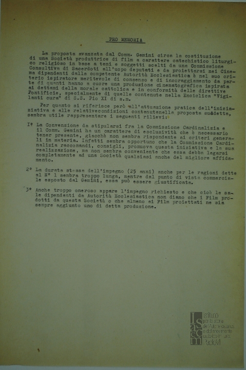 "Pro memoria" circa la costituzione di una società produttrice di film a carattere catechistico, liturgico e religioso