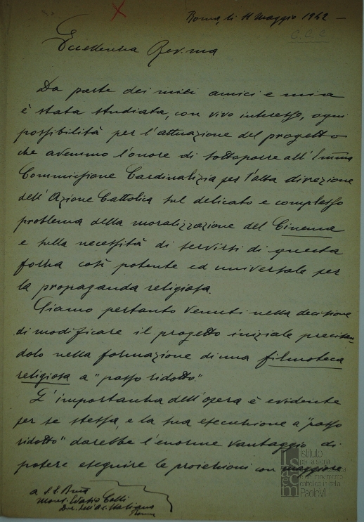 Richiesta di sottoporre al parere della Commissione cardinalizia per l'alta direzione dell'Azione cattolica il progetto per una filmoteca religiosa "a passo ridotto" , con contestuale costituzione di un ufficio tecnico e commerciale per l'esecuzione in esclusiva del programma. Manoscritto