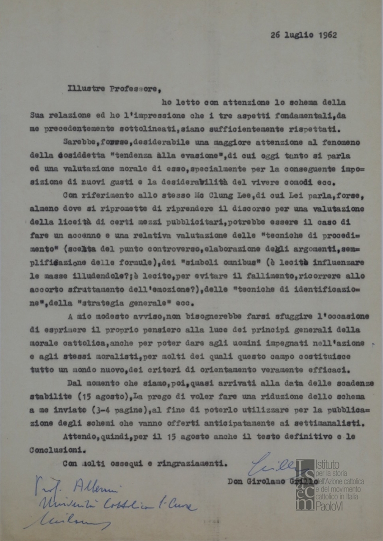 Lettera di don Girolamo Grillo, segretario aggiunto della Settimana sociale dei cattolici, al prof. Francesco Alberoni