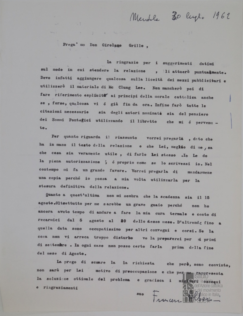 Lettera di Francesco Alberoni a don Girolamo Grillo, segretario aggiunto della Settimana sociale dei cattolici