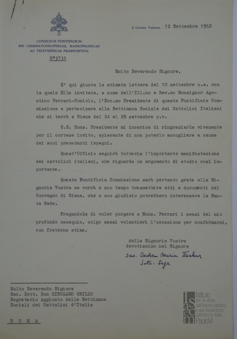 Lettera di Andrzej Maria Deskur, sottosegretario della Pontificia commissione per la cinematografia, radio e televisione, a don Girolamo Grillo, segretario aggiunto della Settimana sociale dei cattolici