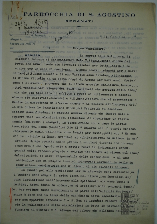 Classificazione morale delle pellicole. Con lettera di trasmissione di don Giuseppe Gentilucci, parroco di Sant'Agostino di Recanati, a destinatario non indicato. Dattiloscritto