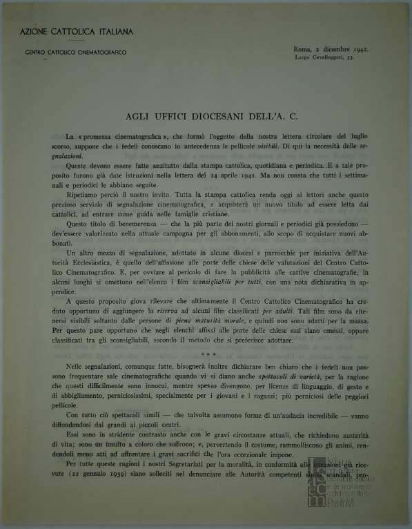 Mons. Evasio Colli invita gli uffici diocesani a considerare l'importanza delle segnalazioni cinematografiche pubblicate dalla stampa cattolica con le relative classificazioni morali dei film e della Giornata per il cinema morale. Documento a stampa