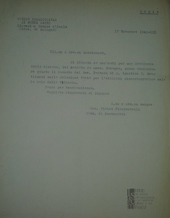 Lettera di don Pietro Piancastelli, parroco della chiesa parrocchiale di Ponte Santo, della diocesi del comune di Imola in provincia di Bologna, a destinatario non indicato