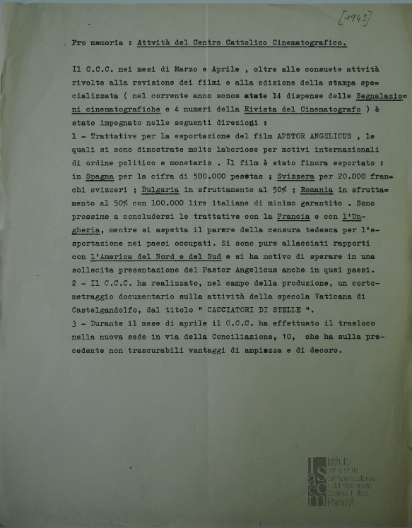 "Pro memoria: Attività del Centro Cattolico Cinematografico"