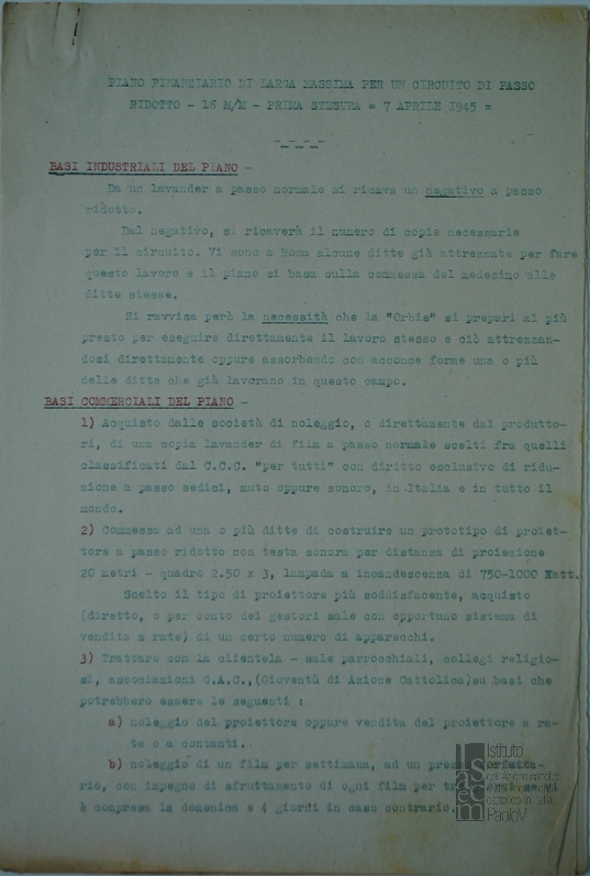 "Piano finanziario di larga massima per un circuito di passo ridotto 16 M/M - prima stesura - 7 aprile 1945"