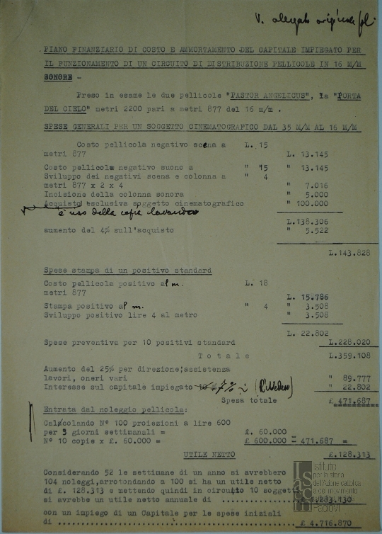 "Piano finanziario di costo e ammortamento del capitale impiegato per il funzionamento di un circuito di distribuzione pellicole in 16 M/M sonore"