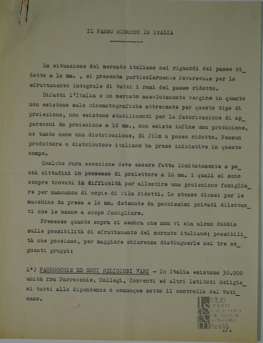 Relazione sulla situazione del mercato italiano a proposito dell'utilizzo delle pellicole a passo ridotto 16 mm. Dattiloscritto