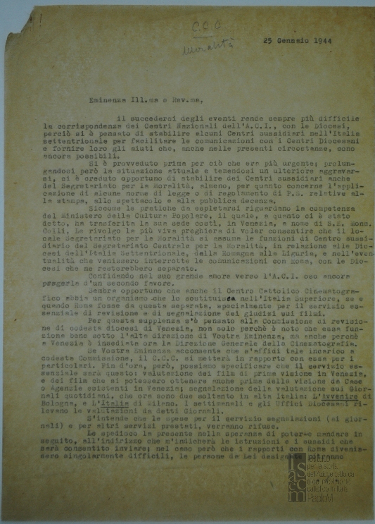 Mons. Giuseppe Borghino scrive in merito alla difficoltà di comunicazione tra i centri nazionali dell'ACI e gli uffici diocesani e all'ipotesi di istituire centri sussidiari del Segretariato per la Moralità nell'Italia settentrionale per agevolare una corretta applicazione delle norme vigenti in materia di stampa, spettacoli e pubblica decenza. Dattiloscritto