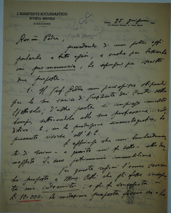 Mons. Luigi Civardi scrive in merito al trattamento economico di Luigi Gedda e ad altre questioni organizzative interne al CCC da trattare in un prossimo convegno. Manoscritto