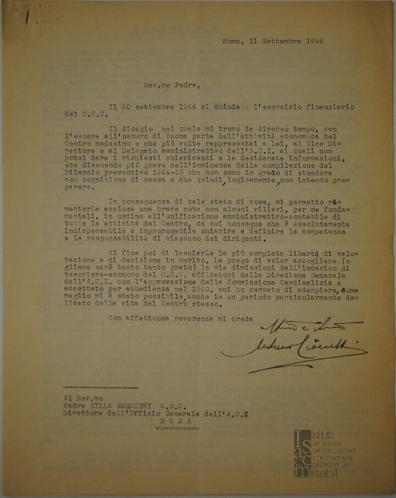 Urbano Cioccetti scrive a mons. Gilla Vincenzo Gremigni in merito alla gestione amministrativo-contabile del Centro cattolico cinematografico - CCC e presenta le sue dimissioni dall'incarico di tesoriere-economo del Centro. Dattiloscritto