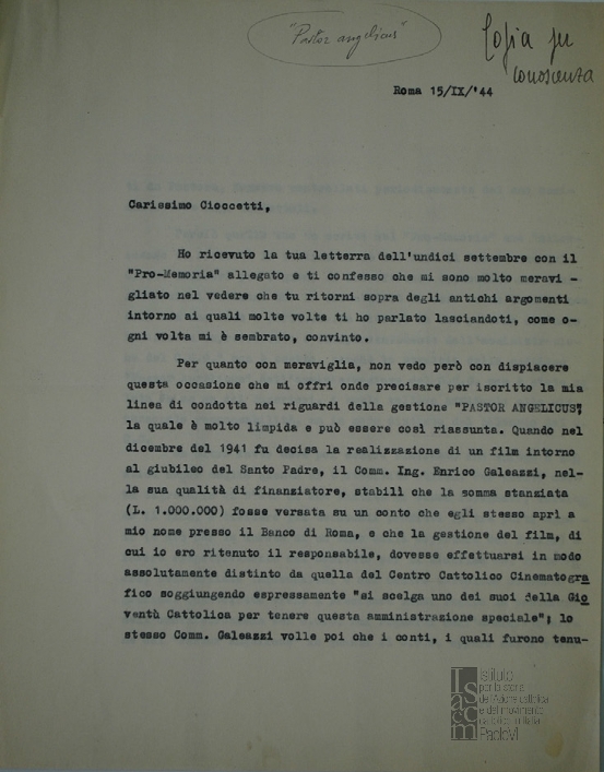 Luigi Gedda scrive a Urbano Cioccetti a proposito degli aspetti economici e finanziari della realizzazione del film "Pastor Angelicus", puntualizzando la posizione amministrativa del CCC nell'ambito della produzione e della gestione del film. Dattiloscritto