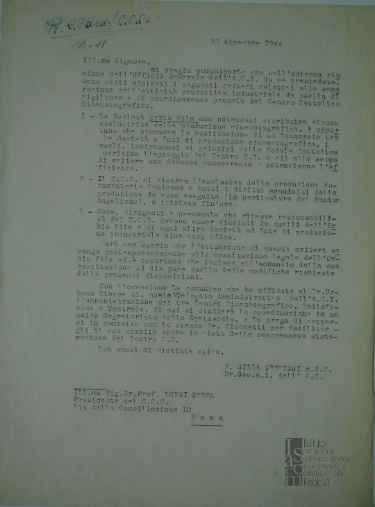 Lettera di mons. Gilla Vincenzo Gremigni, direttore generale dell'ACI, a Luigi Gedda, presidente del Centro cattolico cinematografico - CCC