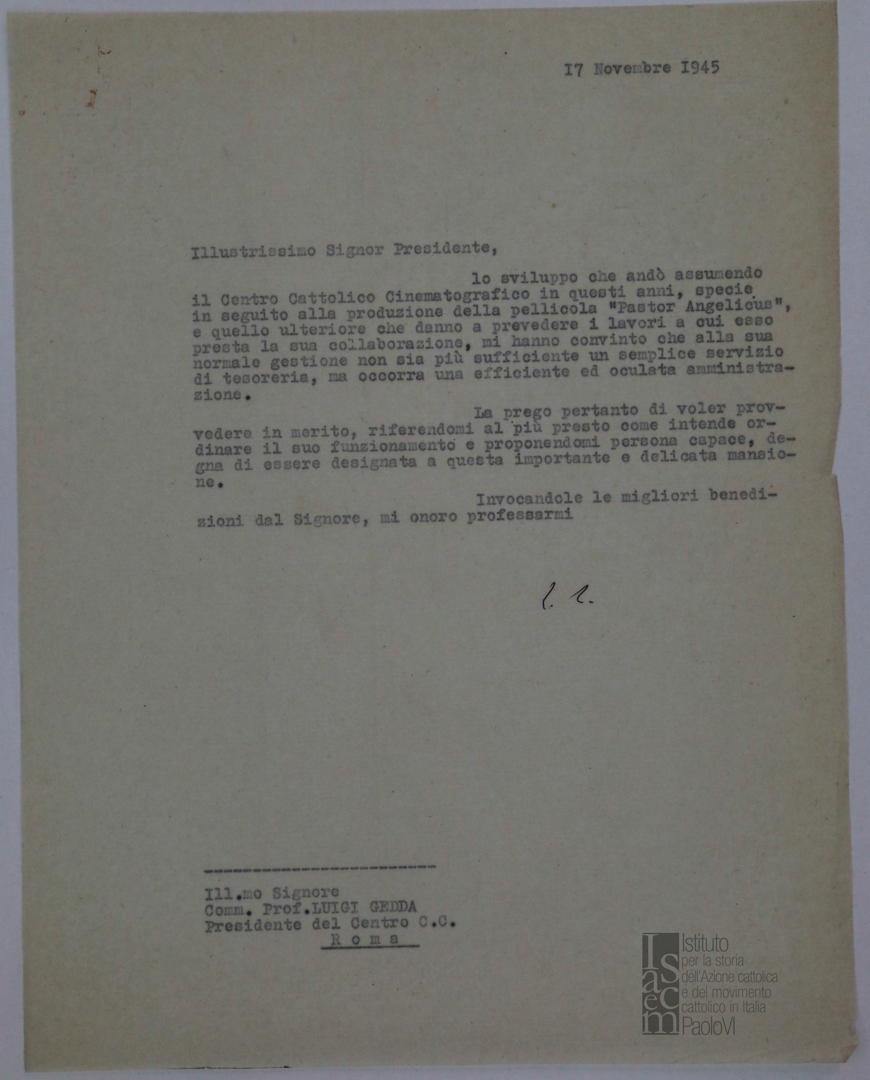 Lettera del cardinale Luigi Lavitrano, arcivescovo di Palermo e presidente della Commissione cardinalizia dell'ACI, a Luigi Gedda, presidente del Centro cattolico cinematografico - CCC