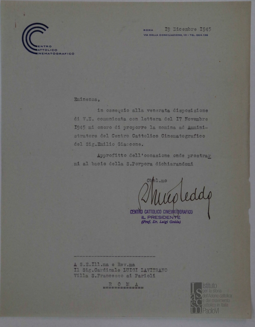 Luigi Gedda risponde al cardinale Luigi Lavitrano proponendo la nomina di Emilio Giaccone a nuovo amministratore del Centro. Dattiloscritto