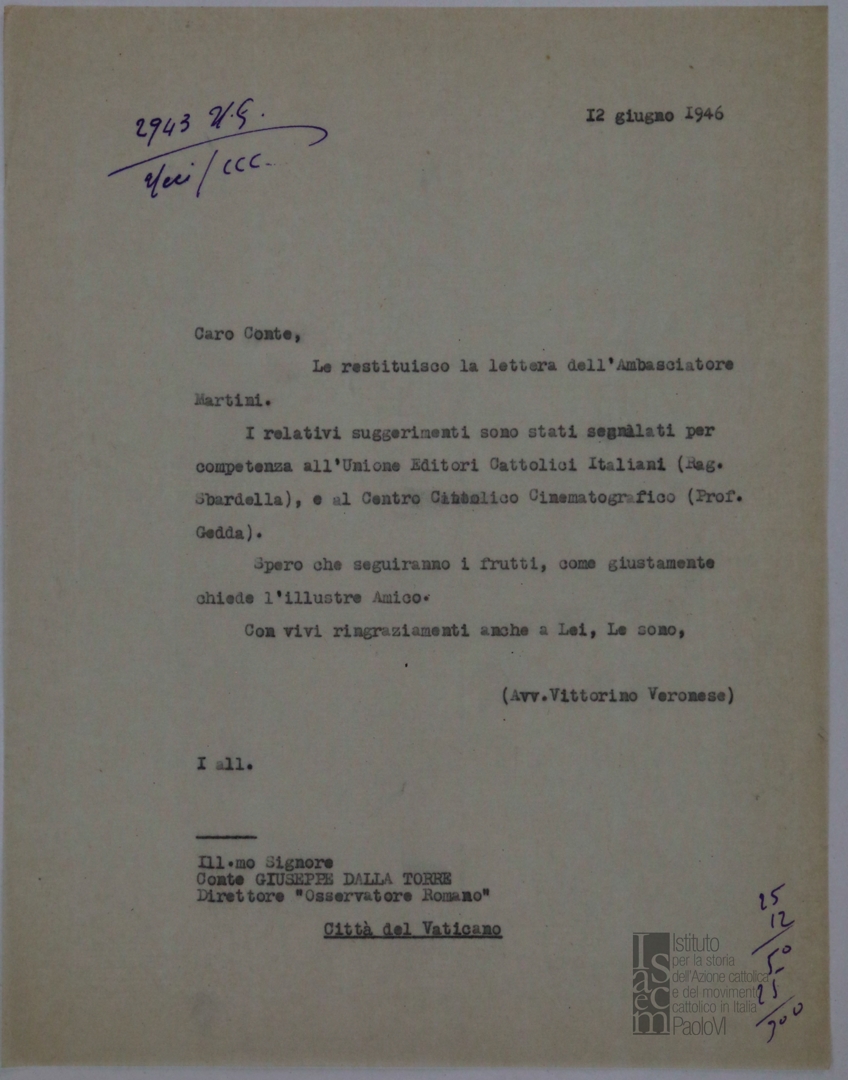 Lettera di Vittorino Veronese, segretario generale dell'ACI, a Giuseppe Dalla Torre, direttore de L'Osservatore Romano
